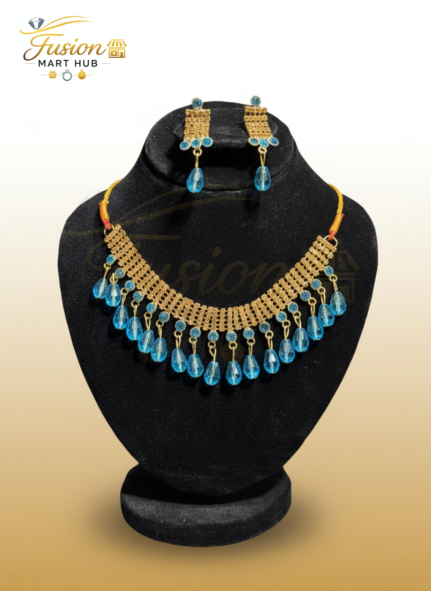Crafted with high-quality materials, the gold-toned mesh necklace ensures durability while maintaining a lightweight feel for all-day comfort. The shimmering blue crystals are expertly set, reflecting exquisite attention to detail and timeless beauty. This set is a must-have accessory for those who value impeccable craftsmanship.