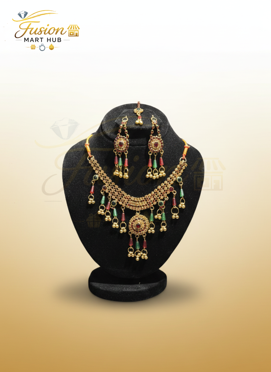 Step into a world of sophistication with this vibrant gold-toned jewelry set. Designed with precision and adorned with a captivating multi-colored stone fringe, it’s the perfect accessory for any occasion.