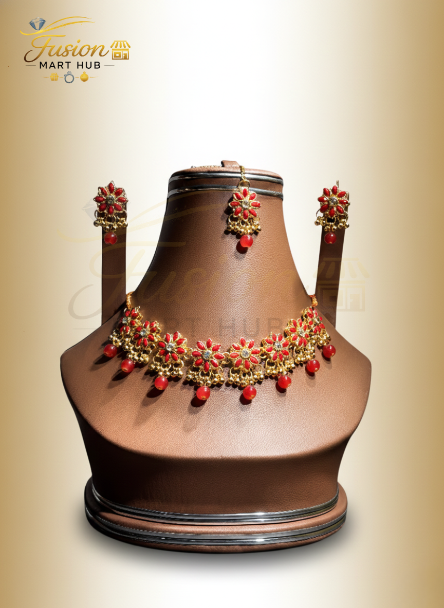 Introducing a stunning traditional gold-toned jewelry set, exquisitely designed to bring timeless elegance and sophistication to your collection. This set features vibrant red floral motifs that lend a captivating contrast to the opulent gold finish, making it ideal for special occasions or cultural celebrations.