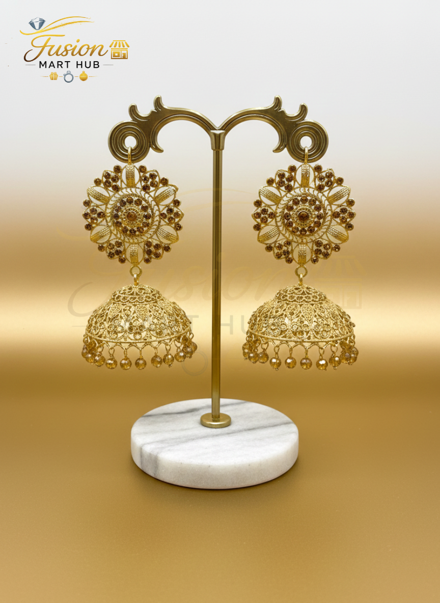 Refined gold-on-gold jhumkay adorned with shimmering golden crystals and matching amber-toned beads for a sophisticated royal look.