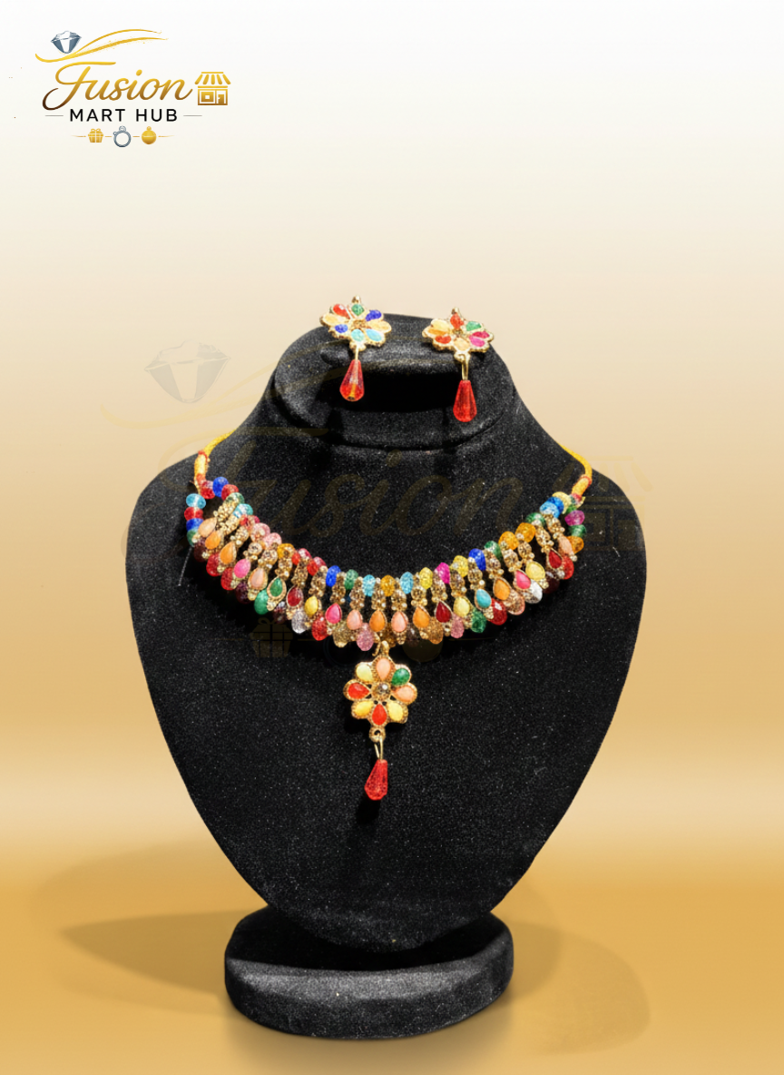 Make a bold statement with this exquisite gold-toned necklace set, designed to bring color and charm to any outfit. Encrusted with an array of multi-colored teardrop beads, this piece strikes the perfect balance between playful vibrance and timeless sophistication.