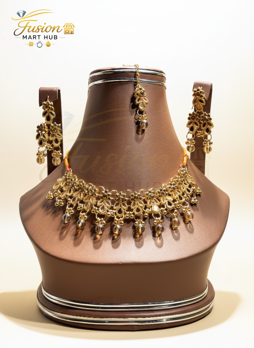 This gold-toned necklace set is more than just an accessory; it’s a celebration of intricate design and timeless beauty. Let the floral pattern and meticulous craftsmanship make an unforgettable style statement wherever you go.